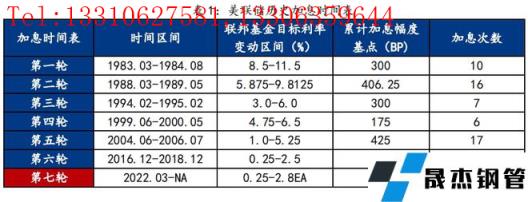 從歷史上來看(表1),美聯(lián)儲一共進(jìn)行了6輪加息周期,雖然美聯(lián)儲基于同樣的出發(fā)點(diǎn)為了控制通脹風(fēng)險(xiǎn),維持經(jīng)濟(jì)穩(wěn)步發(fā)展進(jìn)行調(diào)控,但其中造成每次加息的因素多種多樣,最早的時(shí)間可以追溯到1983年期間,美國在經(jīng)濟(jì)復(fù)蘇的初期中通脹率達(dá)到了驚人的13.5%后美聯(lián)儲急需控制通脹率;也不乏在1999與2004年中為了對抗互聯(lián)網(wǎng)泡沫以及房地產(chǎn)泡沫;在2016年第六輪加息中為了平衡前期充分的量化寬松。北京時(shí)間3月17日零點(diǎn)美聯(lián)儲第七輪加息正式落地,其中根據(jù)圖1美聯(lián)儲FOMC點(diǎn)陣圖做出的預(yù)判,本年度2022年加息次數(shù)將預(yù)計(jì)達(dá)到7次,并且在2023年底利率將達(dá)到2.8%。