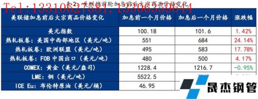 那么,在美聯(lián)儲歷史上進(jìn)行加息的時(shí)間區(qū)間中,大宗商品價(jià)格都是如何變化的呢?選取了美聯(lián)儲第六輪加息期間(2016.12-2018.12)美元指數(shù)、熱軋板卷、黃金、銅、布倫特原油作為參考標(biāo)的進(jìn)行分析,其中參考時(shí)間維度為2016年加息落地前一個(gè)月的交易日價(jià)格與加息落地后一個(gè)月的交易日價(jià)格(表2)。