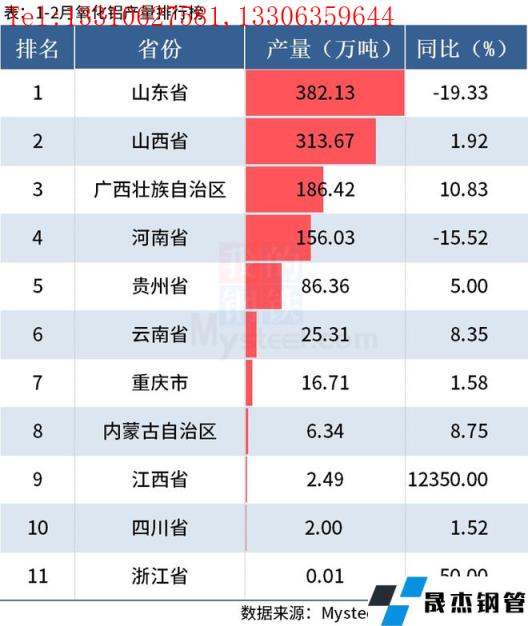 國(guó)家統(tǒng)計(jì)局?jǐn)?shù)據(jù)顯示,2022年1-2月,中國(guó)氧化鋁產(chǎn)量1177.5萬(wàn)噸,同比下降7.3%。其中,山東和河南氧化鋁產(chǎn)量分別同比下降19.33%和15.52%,廣西氧化鋁產(chǎn)量同比增長(zhǎng)10.83%。