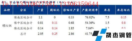 1、調(diào)研數(shù)據(jù)顯示,統(tǒng)計(jì)的河南地區(qū)10家建筑厚壁無(wú)縫鋼管樣本無(wú)縫厚壁鋼管廠(chǎng)家中,河南省建材無(wú)縫厚壁鋼管廠(chǎng)家螺紋鋼日產(chǎn)量2.05萬(wàn)噸,產(chǎn)量較上周增加0.25萬(wàn)噸。檢修/限產(chǎn)影響建材日產(chǎn)量為2.86萬(wàn)噸,產(chǎn)能利用率為41.75%,較上周增加13.89%。