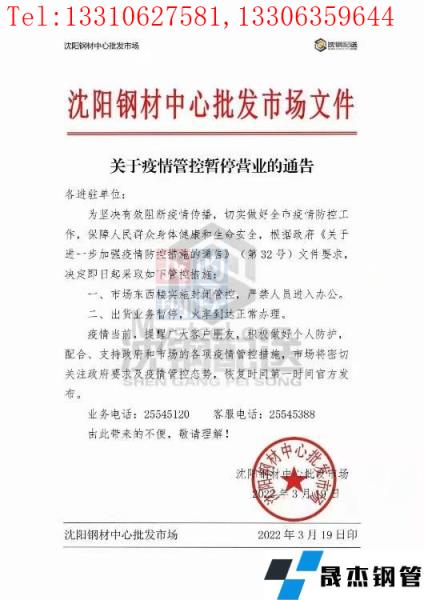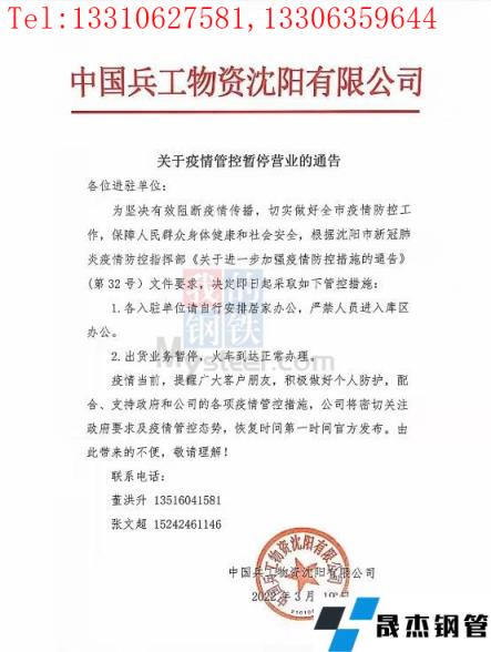 目前沈陽厚壁無縫鋼管中心批發(fā)市場已發(fā)布通告,19日起北一西路東西樓試試封閉管控、嚴(yán)禁人員進(jìn)入辦公,出庫業(yè)務(wù)暫停、火車到達(dá)正常辦理;中國兵工物資125庫通告19日起嚴(yán)禁人員進(jìn)入庫區(qū)辦公,出庫業(yè)務(wù)暫停、火車到達(dá)正常辦理;國家糧食和物資儲備局遼寧局二三九處通告19日起辦公樓嚴(yán)禁進(jìn)出,庫內(nèi)所有出入庫業(yè)務(wù)暫停、火運(yùn)到達(dá)正常辦理。市內(nèi)其他主要厚壁無縫鋼管市場反饋暫時正常辦公及出庫,但從防控指揮部通告內(nèi)容來看、也有暫停營業(yè)的傾向。(通告見文末圖片)