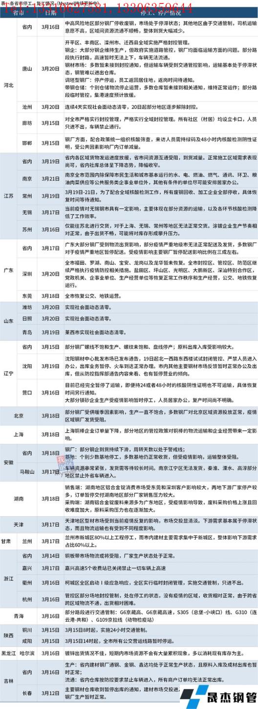 截至3月21日,匯總了16個省份停工停產(chǎn)最新信息。其中,3月21日,南京全市范圍內(nèi)除保障市民生活和城市基本運行的水、電、燃油、燃?xì)狻⑼ㄓ?、環(huán)衛(wèi)、糧油肉菜供應(yīng)等公共服務(wù)類企事業(yè)單位外,其他有條件的單位盡可能安排居家辦公。3 月20日,唐山開平區(qū)、豐南區(qū)、灤州市、遷西縣全域?qū)嵤﹪?yán)格封控管理;大部分鋼企維持生產(chǎn),但政府實施道路管控,無縫厚壁鋼管廠家均面臨運輸方面的問題。深圳全市福田、羅湖、南山、寶安、龍崗以及龍華暫未恢復(fù),全市封控區(qū)、管控區(qū)、防范區(qū)繼續(xù)嚴(yán)格執(zhí)行疫情防控相關(guān)措施。山東濰坊日照、青島萊西市實現(xiàn)社會面動態(tài)清零。河北滄州連續(xù)4天實現(xiàn)社會面動態(tài)清零,3月20日起部分地區(qū)逐步解除封控。具體情況如下: