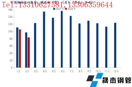 2022年2月我國鍍鋅板(帶)出口總量共計83.52萬噸,年同比下降14.5%;2022年1-2月份我國鍍鋅板(帶)出口總量共計189.43萬噸,年同比下降9.4%。