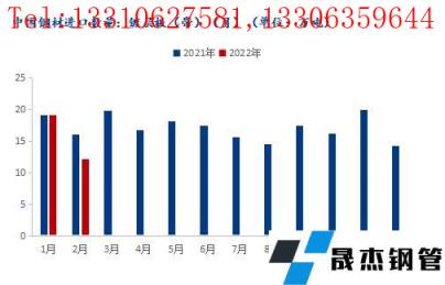 2022年2月我國鍍鋅板(帶)進口總量共計12.21萬噸,年同比下降24.1%;2022年1-2月份我國鍍鋅板(帶)進口總量共計31.32萬噸,年同比下降11.0%。