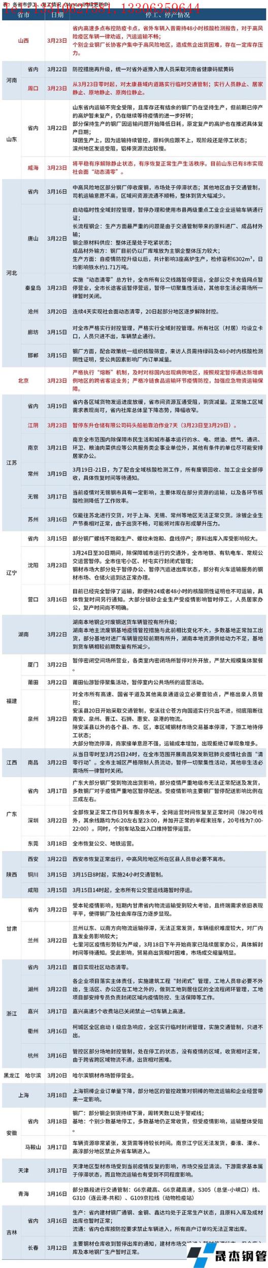 截至3月24日,匯總了20個(gè)省份停工復(fù)工最新信息。其中,3月23日,山西省內(nèi)高速多點(diǎn)布控防疫卡點(diǎn),省外車輛入晉需持48小時(shí)核酸檢測(cè)報(bào)告,對(duì)于高風(fēng)險(xiǎn)疫區(qū)車輛一律勸返,汽運(yùn)運(yùn)輸不暢;個(gè)別企業(yè)無(wú)縫厚壁鋼管廠家長(zhǎng)協(xié)客戶集中于高風(fēng)險(xiǎn)地區(qū),造成焦企出貨困難,存在一定庫(kù)存壓力。河南周口從3月23日零時(shí)起,對(duì)太康縣域內(nèi)道路實(shí)行臨時(shí)交通管制;實(shí)行人員靜止、居家靜止、原地靜止、原崗位靜止。山東威海于3月23日將平穩(wěn)有序解除靜止?fàn)顟B(tài),有序恢復(fù)正常生產(chǎn)生活秩序,目前山東已有8市實(shí)現(xiàn)社會(huì)面“動(dòng)態(tài)清零”。具體情況如下: