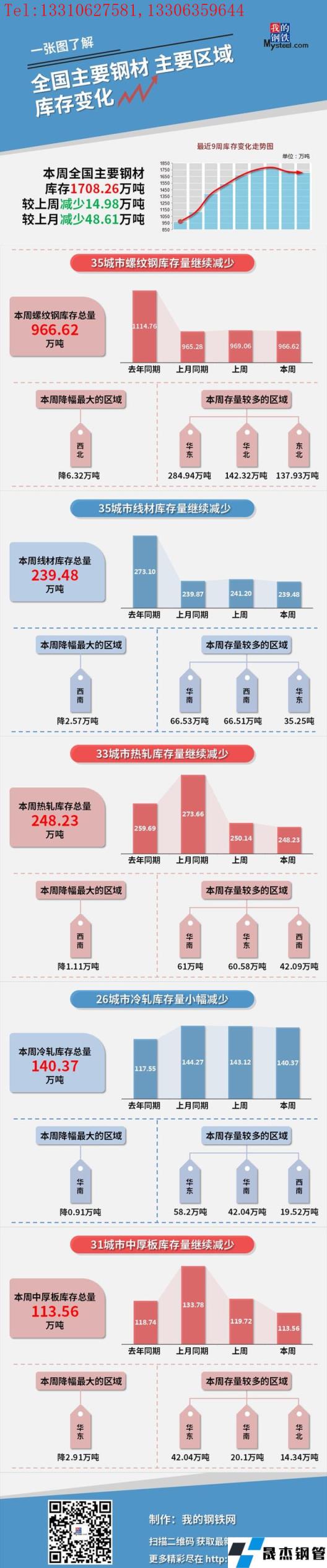 本周,全國主要厚壁無縫鋼管社會庫存1708.26萬噸,較上周減少14.98萬噸,較上月減少48.61萬噸;螺紋鋼庫存總量966.62萬噸。