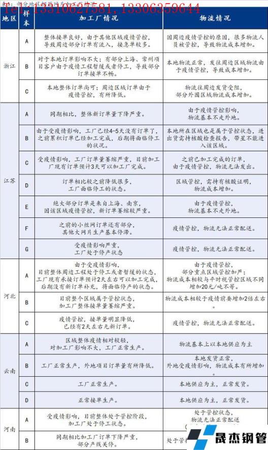 截至3月23日,匯總了部分省份19家鋼筋網(wǎng)片加工廠最新信息,其中浙江3家,江蘇7家,河北3家,云南4家,河南2家。從調(diào)研結(jié)果來看,江蘇、河北、河南受疫情影響較嚴(yán)重,因工程項目停工或者暫緩對于網(wǎng)片需求整體有遞延,導(dǎo)致加工廠新訂單相較于往年有個明顯的萎縮,部分沒有受太大影響的區(qū)域物流成本也有相應(yīng)的增加。具體情況如下: