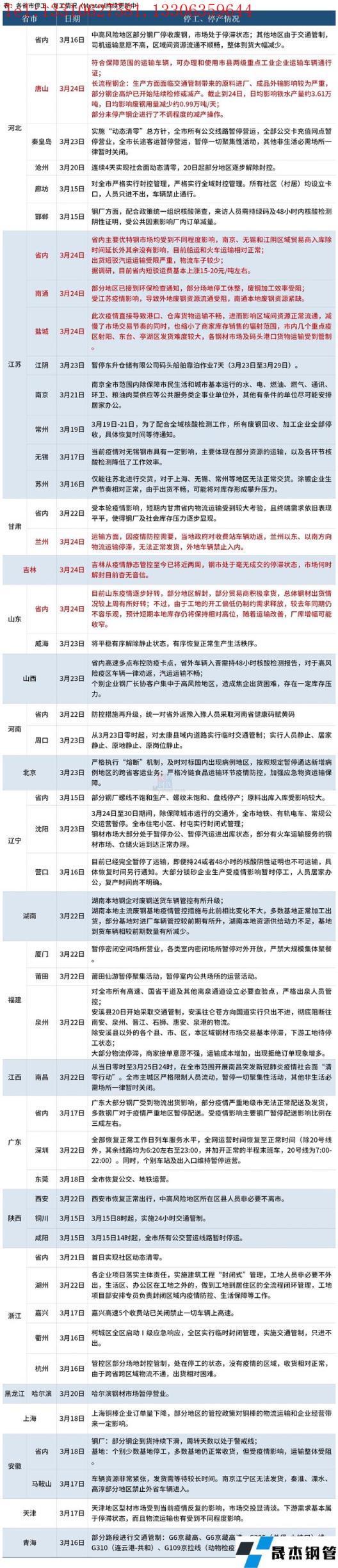 截至3月25日,匯總了20個(gè)省份停工復(fù)工最新信息。其中,河北唐山市符合保障范圍的運(yùn)輸車輛,可辦理和使用市縣兩級(jí)重點(diǎn)工業(yè)企業(yè)運(yùn)輸車輛通行證。江蘇南通部分地區(qū)已接到環(huán)保檢查通知,部分場地停工休整,廢鋼加工效率受阻。吉林從疫情靜態(tài)管控至3月24日將近兩周,鋼市處于毫無成交的停滯狀態(tài),市場何時(shí)解封目前杳無音信。具體情況如下: