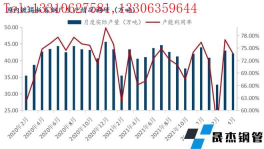 調(diào)研數(shù)據(jù)顯示:據(jù)監(jiān)測的26家鍍錫板生產(chǎn)企業(yè)中,共計49條產(chǎn)線,2022年4月份產(chǎn)能利用率73.68%,月環(huán)比下降3.31%,同比下降1.09%;4月實際產(chǎn)量42.14萬噸,月環(huán)比減少0.87萬噸,同比減少0.55萬噸。從4月份供應看,月環(huán)比小幅下降,主要是江蘇地區(qū)部分無縫厚壁鋼管廠家因疫情影響,原料供應收到影響,導致該區(qū)域馬口鐵產(chǎn)量收到影響。從歷年馬口鐵供應看情況看每月40-45萬噸處于相對正常水平,3-4月國內(nèi)馬口鐵供應恢復正常水平。