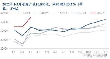2022年1-3月全國原煤產(chǎn)量累計生產(chǎn)10.8億噸,同比增長10.3%,其中3月份原煤產(chǎn)量3.96億噸,同比增長14.8%。國家能源局3月發(fā)布《2022年能源工作指導意見》,提出將著力增強國內(nèi)能源生產(chǎn)保障能力,切實把能源飯碗牢牢地端在自己手里。