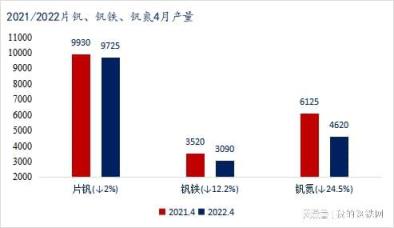 2022年4月片釩產(chǎn)量相比2021年同比下降2%;釩鐵同比下降12.2%;釩氮合金同比下降24.5%。兩年相比片釩產(chǎn)量變動(dòng)不大,釩氮合金及釩鐵產(chǎn)量下降明顯,其原因在于4月合金企業(yè)受到上下游雙向擠壓,利潤(rùn)單薄甚至虧損,從而影響了4月開工率,進(jìn)入5月,合金企業(yè)依舊面臨倒掛問題,不排除開工率會(huì)進(jìn)一步收縮。