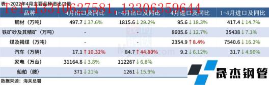 ◎ 海關(guān)總署:2022年4月中國(guó)出口厚壁無(wú)縫鋼管497.7萬(wàn)噸,較上月增加3.2萬(wàn)噸,同比下降37.6%;1-4月累計(jì)出口厚壁無(wú)縫鋼管1815.6萬(wàn)噸,同比下降29.2%。其他主要品種進(jìn)出口量情況如下: