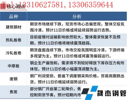 熱軋板卷:5月10日,全國(guó)24個(gè)主要城市4.75mm熱軋板卷均價(jià)5012元/噸,較上個(gè)交易日下跌55元/噸。受昨日夜盤(pán)影響,現(xiàn)貨市場(chǎng)早盤(pán)開(kāi)始,貿(mào)易商悲觀情緒濃厚,午后盤(pán)面尾盤(pán)有小幅拉升,華東區(qū)域現(xiàn)貨價(jià)格也隨之小幅回調(diào),但成交寥寥無(wú)幾。整體來(lái)看,國(guó)內(nèi)目前疫情對(duì)運(yùn)輸影響依然較大,華東區(qū)域解封仍需一段時(shí)間,整體需求恢復(fù)不及預(yù)期,預(yù)計(jì)11日熱卷現(xiàn)貨市場(chǎng)價(jià)格將繼續(xù)震蕩趨弱。