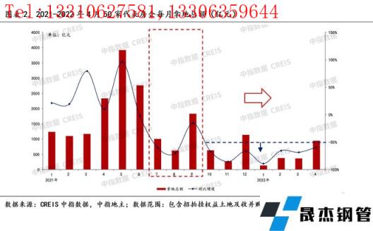 那么,預(yù)判今年用鋼情況的話,可以參考從2021年-2022年4月份以來(lái)的50家代表房企每月拿地總額數(shù)據(jù),假如往前倒推6個(gè)月,2022年1月起的房地產(chǎn)用鋼情況大致可以參照2021年7月起的拿地?cái)?shù)據(jù),因?yàn)樗⒎且灰粚?duì)應(yīng)的關(guān)系。我們可以看到,從2021年10月以來(lái)的拿地?cái)?shù)據(jù)不容樂(lè)觀,單月同比跌幅持續(xù)低于-50%水平線以下,預(yù)示接下來(lái)三季度的房地產(chǎn)新開(kāi)工以及其用鋼情況理論上應(yīng)該是很差的。