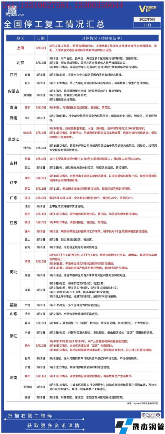 截至5月11日,據(jù)不完全統(tǒng)計,共有16個省份發(fā)布了停工復工最新信息。鄭州主城區(qū)、哈爾濱等地有序恢復正常生產(chǎn)生活秩序。承德市區(qū)實施臨時性封控管理。具體情況如下: