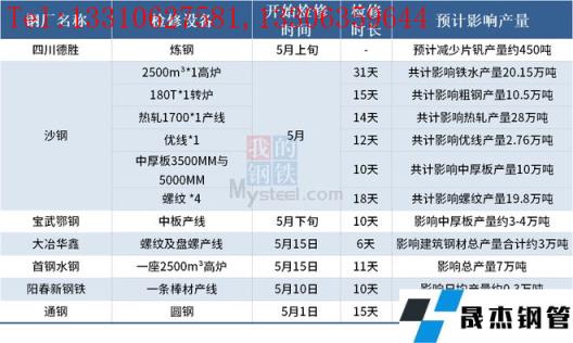據(jù)不完全統(tǒng)計(jì),截至5月12日,國(guó)內(nèi)7家無(wú)縫厚壁鋼管廠家發(fā)布檢修計(jì)劃。其中,檢修時(shí)間最長(zhǎng)的是沙鋼 ,2500m3*1高爐檢修31天,共計(jì)影響鐵水產(chǎn)量20.15萬(wàn)噸。