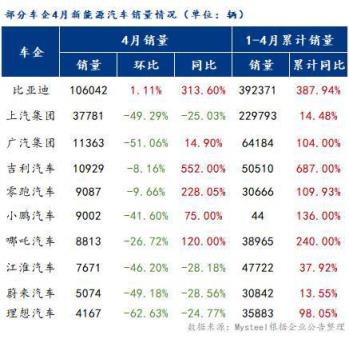 據(jù)統(tǒng)計,截至5月11日,4月銷量與上年同期相比,比亞迪銷量增速依然最為明顯。具體來看,比亞迪銷量106042輛穩(wěn)居第一,環(huán)比增長1.11%,同比增長313.6%;其次是上汽集團銷量37781輛,環(huán)比下降49.29%,同比下降25.03%,值得一提的是吉利汽車銷量增幅最大,高達552%。受疫情影響,4月份絕大部分新能源車企銷量全線大跌,上汽、廣汽、小鵬等自主品牌車企無一例外集體銷量下滑,跌幅超過兩位,而比亞迪卻一直占據(jù)領先地位,銷量不僅沒跌,還一直保持穩(wěn)增長。