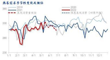 4月下旬開始海外熱卷的緊張程度有所緩解,一方面,西歐對(duì)于高價(jià)格的承受能力有限,導(dǎo)致了市場(chǎng)的投機(jī)情緒有所下降;另一方面,俄烏資源也恢復(fù)了一部分出口,使得緊張的情況有所緩解。目前歐洲對(duì)于我國的懲罰性關(guān)稅和反補(bǔ)貼稅依然較高,當(dāng)?shù)卦谫徺I時(shí)首選依然不是我國,所以對(duì)于剛需而言,西歐并不在我國鋼鐵出口的范圍內(nèi)。從6-7月船期的情況看,環(huán)比下降的情況概率較大,預(yù)計(jì)在-15%~-20%的水平。下降完以后,國內(nèi)外比價(jià)依然存在,所以大致可以判斷,出口量會(huì)有所維持,但高點(diǎn)已現(xiàn),預(yù)期每個(gè)月量在100-120萬噸水平。