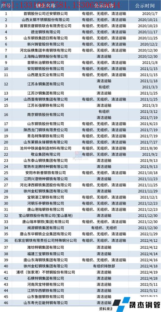 自2020年8月起,中國鋼鐵工業(yè)協(xié)會開展了鋼鐵企業(yè)超低排放改造和評估監(jiān)測進展情況公示工作。截至2022年5月13日,已有46家鋼鐵企業(yè)在鋼協(xié)網站進行公示。5月以來新增4家企業(yè),分別為河南鳳寶特鋼有限公司、江陰華西鋼鐵有限公司、山東魯麗鋼鐵有限公司和山東壽光巨能特鋼有限公司。