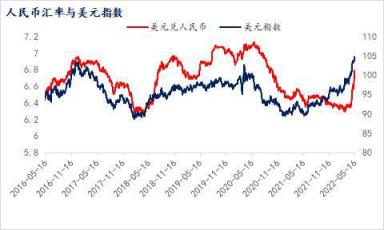 2022年3月,美聯(lián)儲(chǔ)宣布將基準(zhǔn)利率上調(diào)25個(gè)基點(diǎn),正式進(jìn)入加息周期,5月更是宣布一次性加息50個(gè)基點(diǎn),引起了全球資本市場(chǎng)的動(dòng)蕩,而美元作為全球避險(xiǎn)資產(chǎn),在此輪加息過(guò)程中不斷走強(qiáng),截至目前美元指數(shù)年內(nèi)漲幅高達(dá)8.57%。相比來(lái)看,從今年4月中旬開(kāi)始,人民幣匯率卻出現(xiàn)連續(xù)大貶值的走勢(shì),其中人民幣離岸匯率從4月18日的6.372快速貶至5月16日的6.79,幅度達(dá)到6.3%,在岸匯率同期從6.363貶至5月12日的6.7994,幅度達(dá)到6.86%。同期歐元貶值8.2%,日元貶值12.88%,韓幣貶值7.93%,而盧布年初至今對(duì)美元升值1.8%,澳元對(duì)美元微貶2.4%。從匯率上也可以看出,在全球通脹及美元走強(qiáng)背景下,能源原料出口國(guó)如俄羅斯、澳大利亞等國(guó)匯率相對(duì)堅(jiān)挺,而產(chǎn)成品出口國(guó)如中國(guó)、日本、韓國(guó)等面臨較大貶值壓力。