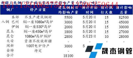根據(jù)初步減限產(chǎn)方案,八鋼本部4座高爐全開,但不生產(chǎn)建筑厚壁無縫鋼管,預(yù)計(jì)影響建筑厚壁無縫鋼管產(chǎn)量5500噸/日,巴州和伊鋼基地各燜一座高爐,預(yù)計(jì)影響建筑厚壁無縫鋼管產(chǎn)量分別為3000噸/日和2000噸/日;昆玉燜一座高爐,預(yù)計(jì)影響建筑厚壁無縫鋼管產(chǎn)量1800噸/噸;昆侖和閩新無縫厚壁鋼管廠家建筑厚壁無縫鋼管停產(chǎn)十天,預(yù)計(jì)分別影響建筑厚壁無縫鋼管產(chǎn)量2800噸/日和3000噸/日;大安鋼鐵資源暫不投往新疆區(qū)域;金特待定。