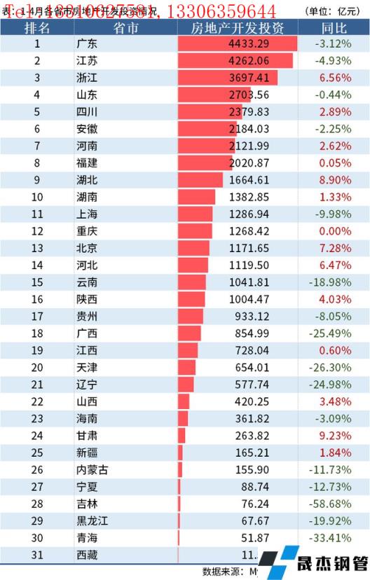 住宅投資方面,投資額超千億的有10個(gè)省市,其中江蘇、廣東和浙江分別以3382.13億元、3208.6億元、2566.62億元的投資額位排名前三。累計(jì)同比方面,有10個(gè)省市同比降幅超10%,其中降幅最大的依然是吉林省,同比下降56.6%;同比增幅超10%的僅有甘肅一省,同比增長(zhǎng)13.06%。