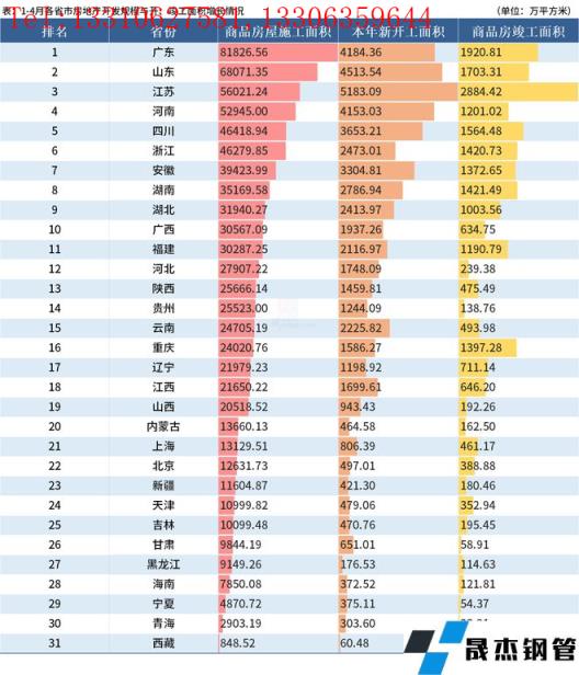 從各省市房地產(chǎn)開發(fā)規(guī)模與開、竣工面積增長(zhǎng)情況來看,31省市1-4月的商品房屋施工面積共818512.92萬平方米,其中25省市施工面積在10000萬平方米以上。排名前三的依然是廣東、山東和江蘇,施工面積均在50000萬平方米以上,其中廣東施工面積超80000萬平方米。排在末三位的為寧夏、青海、西藏,施工面積依然低于5000萬平方米,其中西藏施工面積僅有848.52萬平方米。