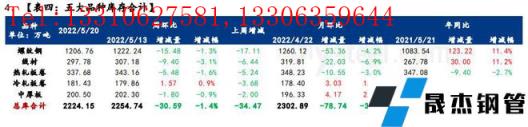 庫存方面,五大品種厚壁無縫鋼管總庫存環(huán)比上周降幅擴張,降至2224.15萬噸,環(huán)比上周減少30.59萬噸,降幅1.36%。分品種看,建材庫存減少24.88萬噸,降幅1.6%;板材庫存減少5.71萬噸,降幅0.8%;分指標看,五大品種無縫厚壁鋼管廠家?guī)齑姝h(huán)比減少1.43萬噸,降幅0.2%;五大品種社會庫存環(huán)比減少29.16萬噸,降幅1.9%。