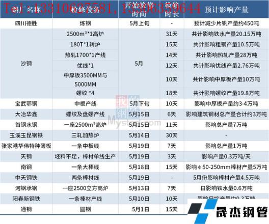 據(jù)不完全統(tǒng)計(jì),截至5月20日,國(guó)內(nèi)13家無(wú)縫厚壁鋼管廠家發(fā)布檢修計(jì)劃。其中,中天鋼鐵因一座轉(zhuǎn)爐檢修,坯料不足,兩條棒材線停產(chǎn)檢修,預(yù)計(jì)5月份影響棒材產(chǎn)量4.5萬(wàn)噸。
