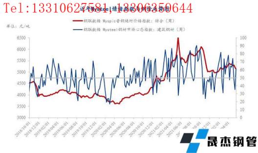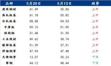具體各品種指數(shù)來(lái)看,5月20日建筑厚壁無(wú)縫鋼管情緒指數(shù)為61.49,較5月13日回升25.93;熱軋板卷情緒指數(shù)為61.18,較5月13日回升10.36;冷軋板卷情緒指數(shù)為58.68,較5月13日回升4.65;中厚板情緒指數(shù)為59.1,較5月13日回升7.15;結(jié)構(gòu)鋼情緒指數(shù)為31.48,較5月13日回升0.39;工業(yè)線材情緒指數(shù)為49.62,較5月13日回升10.88;鍍鋅板卷情緒指數(shù)為51.39,較5月13日回升13.88;焊接厚壁鋼管情緒指數(shù)為47.94,較5月13日回升0.46;無(wú)縫厚壁鋼管情緒指數(shù)為13.07,較5月13日回落22.16;帶鋼情緒指數(shù)為44.12,較5月13日回落4.32。