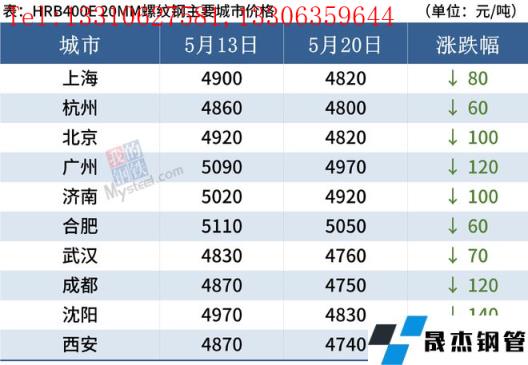 據(jù)監(jiān)測,截至5月20日,全國主要城市20mm三級抗震螺紋鋼均價4849元/噸,較5月13日下跌107元/噸;8.0mmHPB300高線均價5101/噸,較5月7日下跌104元/噸。