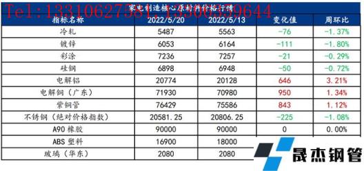 截止2022年5月20日,各原材料當日即時價格以及價格周環(huán)比情況如下: