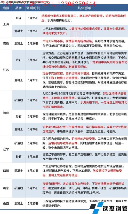 截至5月27日,據(jù)百年建筑網(wǎng)調(diào)研,8個(gè)省份建材市場(chǎng)受到了不同程度的影響。進(jìn)入五月下旬后,施工整體進(jìn)度尚未進(jìn)入“減速”階段,今年整體施工進(jìn)度提升緩慢,市場(chǎng)需求降幅拐點(diǎn)未來(lái)臨。目前疫情防控形勢(shì)繼續(xù)好轉(zhuǎn),建筑材料發(fā)運(yùn)量有一定上升空間?,F(xiàn)華東地區(qū)疫情雖得到了一定的控制,但由于交通管控因素,材料運(yùn)輸仍存在一定壓力。具體情況如下: