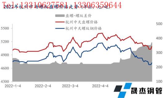 2022年初起受需求偏弱,庫存持續(xù)居高不下影響,浙江市場主流無縫厚壁鋼管廠家盤螺螺紋價差基本穩(wěn)定在200元/噸附近水平。而4月下旬以來,主流無縫厚壁鋼管廠家盤螺與螺紋價差逐步擴大,到5月下旬有進一步擴大的趨勢。截止5月27日,以杭州市場為例,中天HRB40016-25mm螺紋鋼4700元/噸,中天HRB4008-10mm盤螺5080元/噸,盤螺價格高于螺紋鋼380元/噸,由此浙江市場盤螺價格再次成為全國相對高位。近期浙江各市場盤螺庫存加速去化,主流無縫厚壁鋼管廠家盤螺與螺紋價差走勢有進一步擴大的趨勢。筆者調(diào)研了解到主要有以下幾點原因,給大家做個簡要分析: