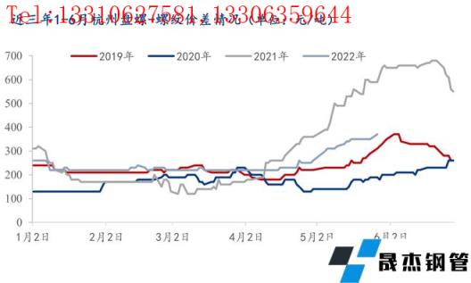 由上圖所示,近三年1-6月份浙江市場盤螺螺紋價差在4-5月份均會呈現(xiàn)逐步擴大走勢,到6月中下旬會達到峰值,隨后逐步下行,回歸正常水平。