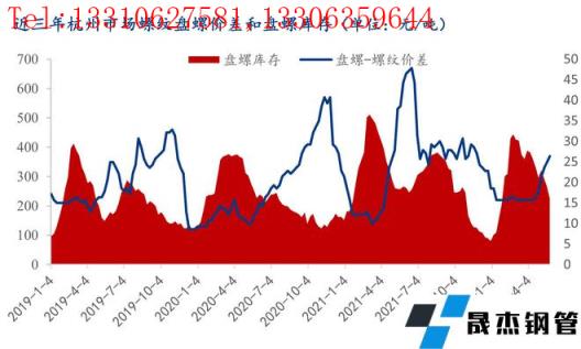 從上圖可以看出,杭州市場盤螺螺紋價差與盤螺的庫存呈負相關的關系,且盤螺的庫存增減較盤螺螺紋價差更具有領先性。截至5月27日,杭州市場盤螺庫存16.07萬噸,較2月底31.69萬噸比下降15.95萬噸,降幅高達49.29%,而杭州市場螺紋庫存較2月底比下降僅14.05%,盤螺庫存下降幅度遠大于螺紋。目前盤螺庫存較前期高位比明顯偏低,對盤螺的高價位有一定支撐。