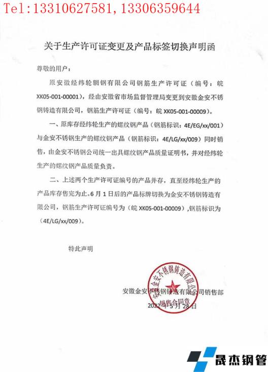 二、上述兩個(gè)生產(chǎn)許可證編號的產(chǎn)品并存,直至經(jīng)緯輪生產(chǎn)的產(chǎn)品庫存售完為止。6月1日后的產(chǎn)品標(biāo)牌切換為金安不銹鋼鑄造有限公司,鋼筋生產(chǎn)許可證編號為(皖XK05-001-00009),鋼筋標(biāo)識為(4E/LG/xx/009)。