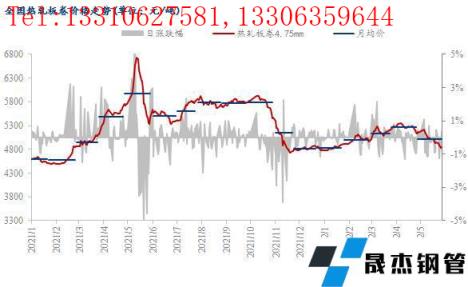 截至5月30日,國(guó)內(nèi)24個(gè)主要城市4.75mm熱軋板卷均價(jià)為4873元/噸,月環(huán)比下跌267元/噸,較去年同期下跌696元/噸。