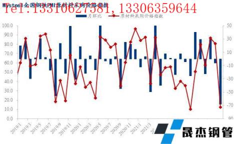 從相關(guān)指數(shù)來看,本月成品材出廠價(jià)指數(shù)大幅回落60.4個(gè)百分點(diǎn)至8.3,刷新年內(nèi)低點(diǎn),無縫厚壁鋼管廠家成品材庫存指數(shù)回落9.5個(gè)百分點(diǎn)至63.4,仍處榮枯線上方。同時(shí)成材價(jià)格下跌倒逼原料價(jià)格,本月原材料采購價(jià)指數(shù)大幅回落68.5個(gè)百分點(diǎn)至12.1,國(guó)內(nèi)原材料采購量指數(shù)回落6.6個(gè)百分點(diǎn)至45.3,國(guó)外原材料采購量指數(shù)回落5.6個(gè)百分點(diǎn)至38.5。