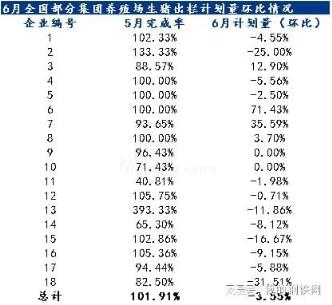 據(jù)農(nóng)產(chǎn)品調(diào)研了解,針對18家集團養(yǎng)殖場全國生豬出欄情況來看,5月生豬出欄完成率總計101.91%,6月出欄量較5月實際出欄量環(huán)比下跌3.55%。