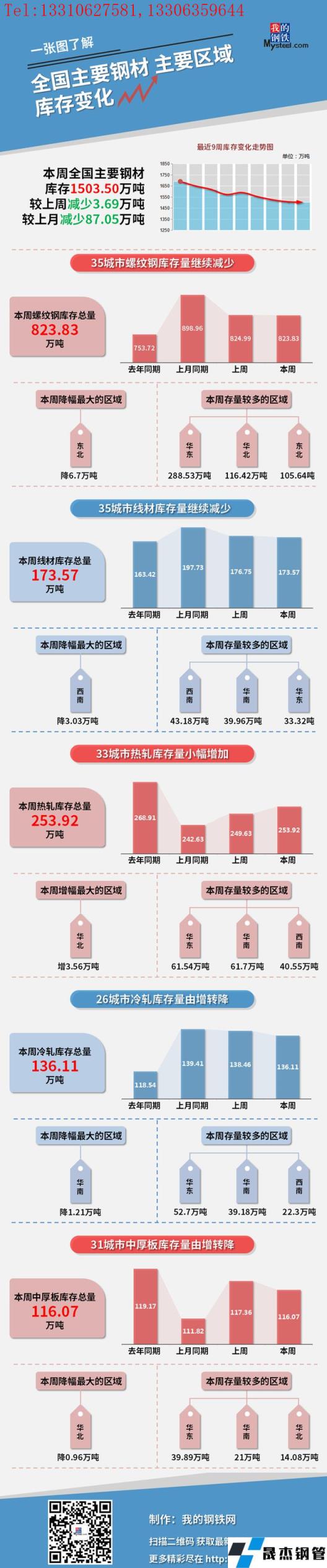本周,全國主要厚壁無縫鋼管社會庫存1503.5萬噸,較上周減少3.69萬噸,較上月減少87.05萬噸;螺紋鋼庫存總量823.83萬噸。