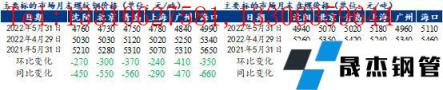 截至5月31日,東北地區(qū)建筑厚壁無(wú)縫鋼管主要流向市場(chǎng)中螺紋鋼價(jià)格???990元/噸最高、環(huán)比上月末跌350元/噸,北京4730元/噸最低、環(huán)比上月末跌300元/噸;盤螺???110元/噸最高、環(huán)比上月末跌350元/噸,沈陽(yáng)4940元/噸最低、環(huán)比上月末跌320元/噸。
