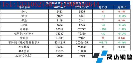 截止2022年6月2日,各原材料當日即時價格以及價格周環(huán)比情況如下: