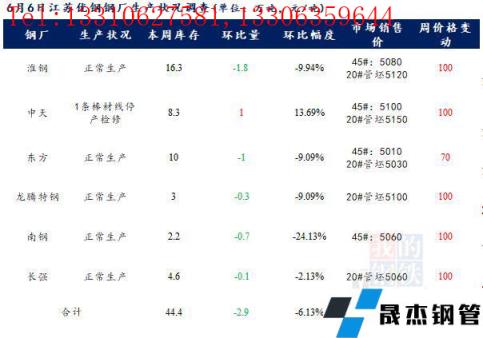 江蘇優(yōu)特?zé)o縫厚壁鋼管廠家棒材總庫(kù)存44.4萬(wàn)噸,較上周減少2.9萬(wàn)噸,環(huán)比降6.13%,較去年同期增加7.24萬(wàn)噸,同比增19.48%,目前省中天1條棒材線檢修,其余無(wú)縫厚壁鋼管廠家正常生產(chǎn)。