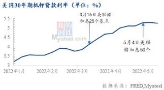 美聯(lián)儲(chǔ)為了抑制國(guó)內(nèi)通脹,分別于3月16日和5月4日加息25和50個(gè)基點(diǎn),預(yù)計(jì)將在今年累計(jì)加息100個(gè)基點(diǎn)。而伴隨著美聯(lián)儲(chǔ)的不斷加息,截至本周,30年期抵押貸款利率飆升至5.1%,處于歷史高位。
