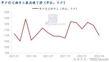 而房貸利率的飛速上漲,使得消費(fèi)者的購(gòu)買(mǎi)欲望隨之下降。再疊加美國(guó)房?jī)r(jià)居高不下,4月現(xiàn)有房屋銷售中位數(shù)價(jià)格同比去年上漲14.8%至391200美元,創(chuàng)1999年以來(lái)新高,導(dǎo)致房屋銷售和單戶新開(kāi)工數(shù)量均出現(xiàn)下滑。截至4月,單戶新開(kāi)工數(shù)量為110萬(wàn),已連續(xù)兩月下降,較今年2月下降9%。