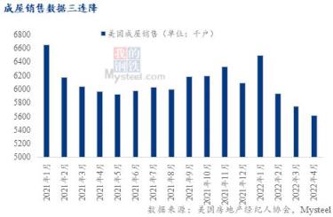 在美聯(lián)儲(chǔ)持續(xù)加息的預(yù)期和房?jī)r(jià)居高不下的雙重壓力下,美國(guó)樓市泡沫逐漸破碎,樓市繁榮面臨考驗(yàn)。我們預(yù)計(jì)5月房屋銷售數(shù)據(jù)和單戶住宅新開(kāi)工數(shù)量均環(huán)比下滑,帶動(dòng)著木材價(jià)格同樣走弱。