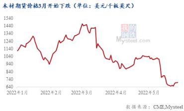 美國(guó)木材價(jià)格與房市高度相關(guān),隨著消費(fèi)者對(duì)房地產(chǎn)的購(gòu)買(mǎi)意愿下降,木材價(jià)格也隨之降溫。美國(guó)木材期貨價(jià)格從今年三月初的高點(diǎn)開(kāi)始下落,截至5月底,木材期貨價(jià)格下降765至700美元/千板英尺。