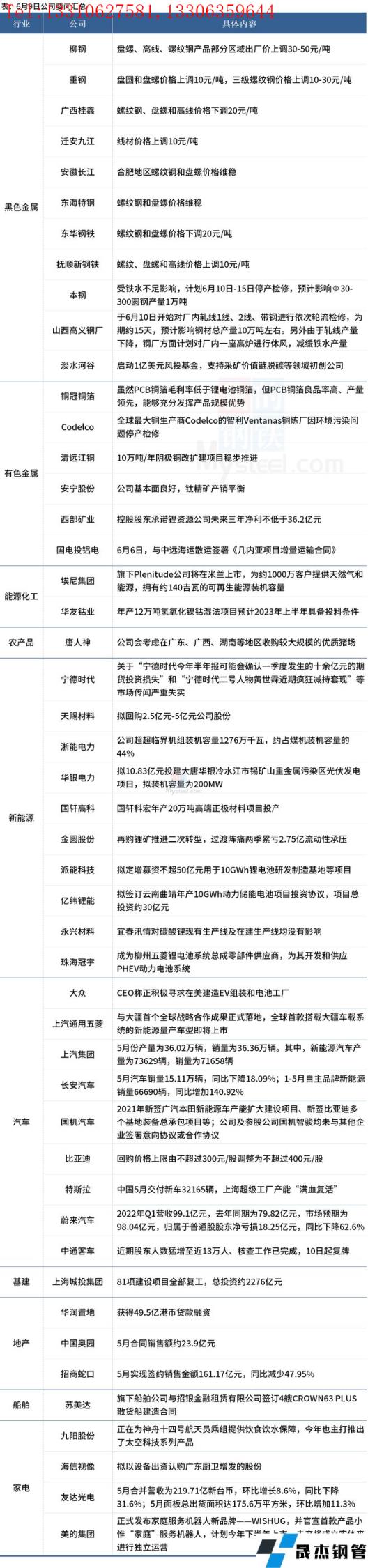 本鋼受鐵水不足影響,計劃6月10日-15日停產檢修;清遠江銅10萬噸/年陰極銅改擴建項目穩(wěn)步推進;華友鈷業(yè)年產12萬噸氫氧化鎳鈷濕法項目預計2023年上半年具備投料條件;特斯拉中國5月交付新車32165輛,上海超級工廠產能“滿血復活”;蔚來發(fā)布Q1財報,營收增長,凈利潤下滑。