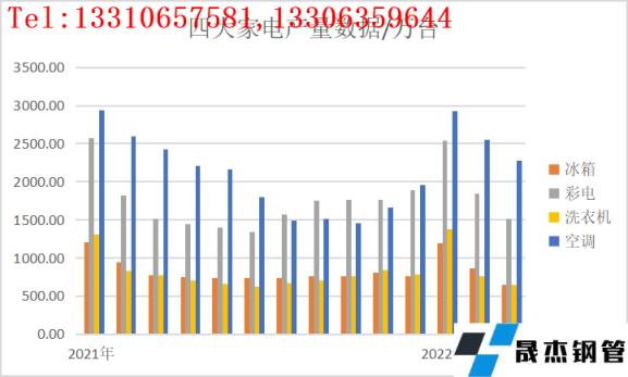 2022年4月份,冰箱產(chǎn)量652.4萬臺,同比下降15.8%;彩電產(chǎn)量1512.7萬臺,同比增長1.5%;洗衣機(jī)產(chǎn)量649.9萬臺,同比下降15.8%;空調(diào)產(chǎn)量2279.2萬臺,同比下降4.0%;